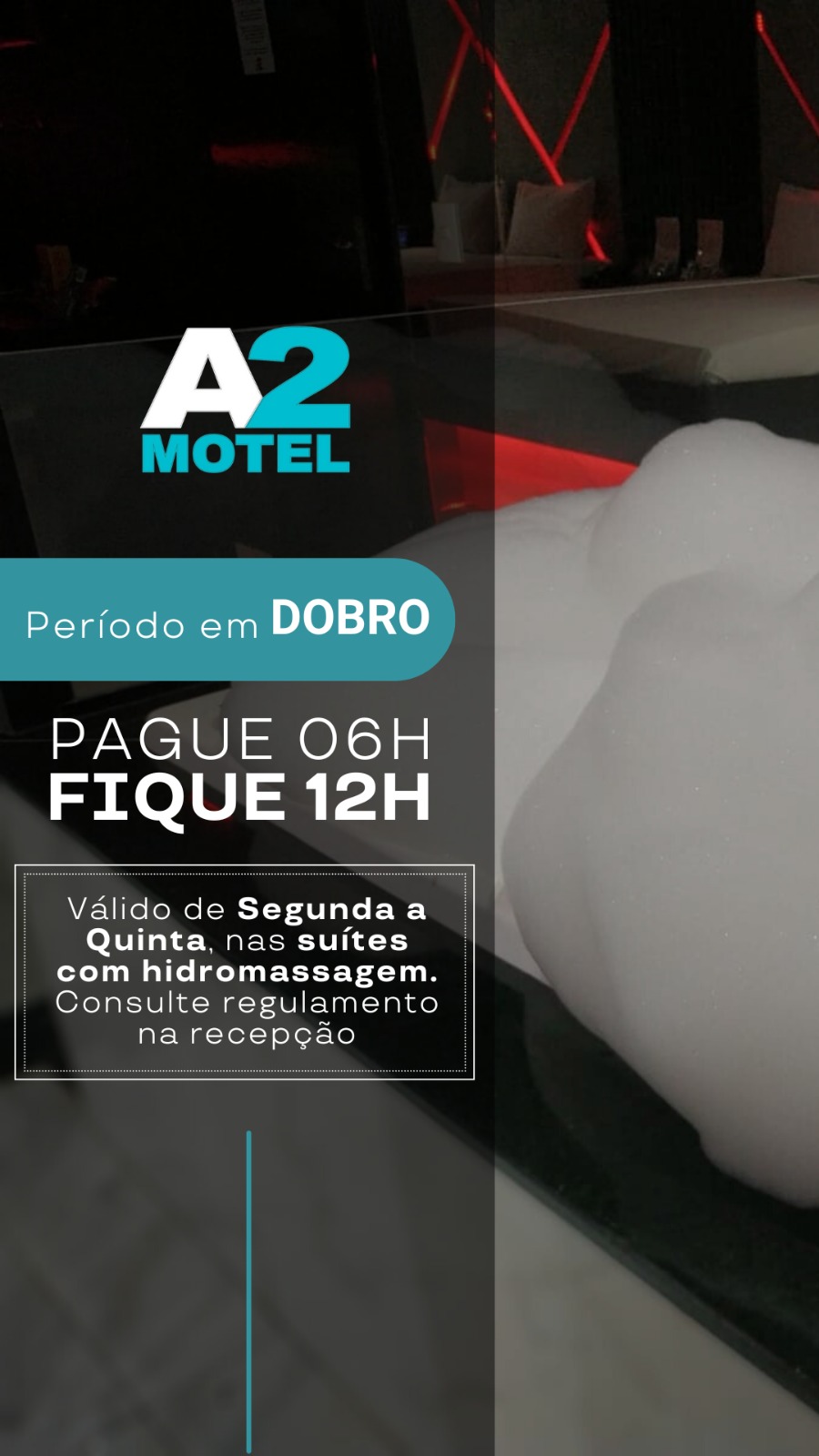 Válido de Segunda a Quinta nas suítes com hidromassagem. *Consulte regulamento na recepção.